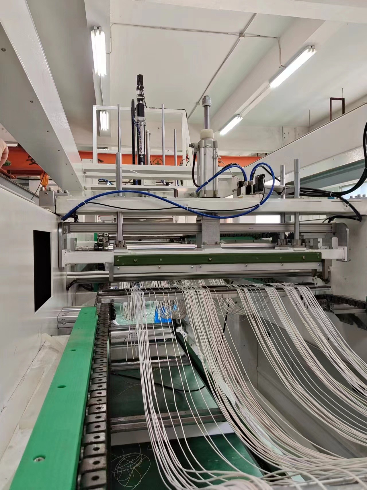 設(shè)備用于MBR膜絲排絲生產(chǎn)。設(shè)備自動(dòng)定長取絲,按規(guī)定寬度排列膜絲,并自動(dòng)涂覆熱熔膠粘合膜絲,粘合牢固后設(shè)備自動(dòng)分片裁切。切片后自動(dòng)抓取進(jìn)行多片多層粘合為整體。